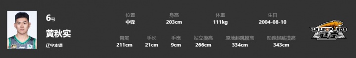 黄秋实8月10日将年满21岁,身高2米03,体重111公斤,司职中锋,还没代表辽宁在CBA正式比赛中出战。