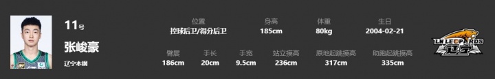 张峻豪现年21岁,身高1米85,体重80公斤,司职后卫,已为辽宁出战了CBA46场常规赛和5场季后赛。